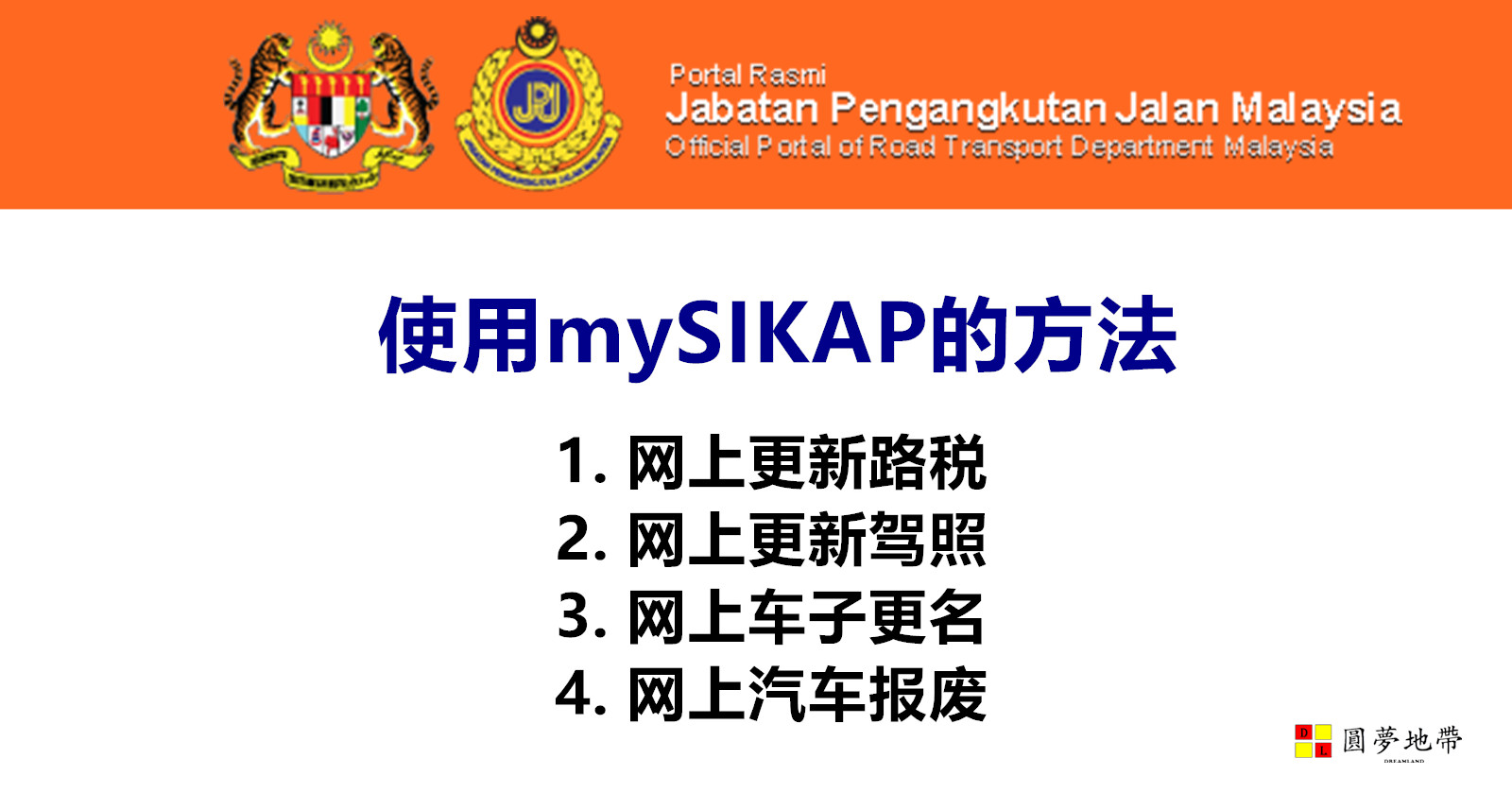 马来西亚陆路交通局(JPJ)推出mySIKAP系统让民众可以透过上网进行更新路税、更新驾照、车子更名或汽车报废手续。这将能节省大家的时间,大家再也无需特别请假或在工作期限抽空前往JPJ处理这些手续。