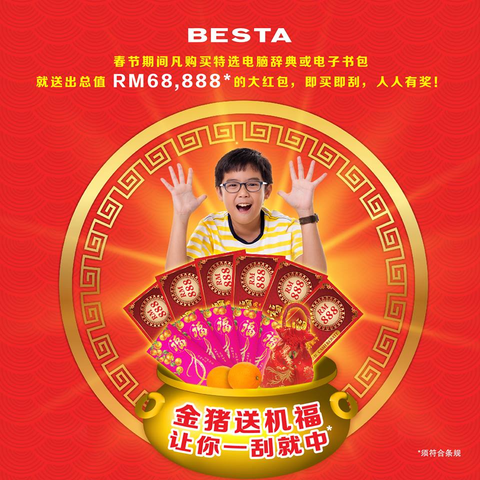配合农历新年的到来,凡是购买特选电脑辞典或电子书包,将可获得总值RM68,888的大红包!让你一刮就中 ,即买即刮,人人有奖。