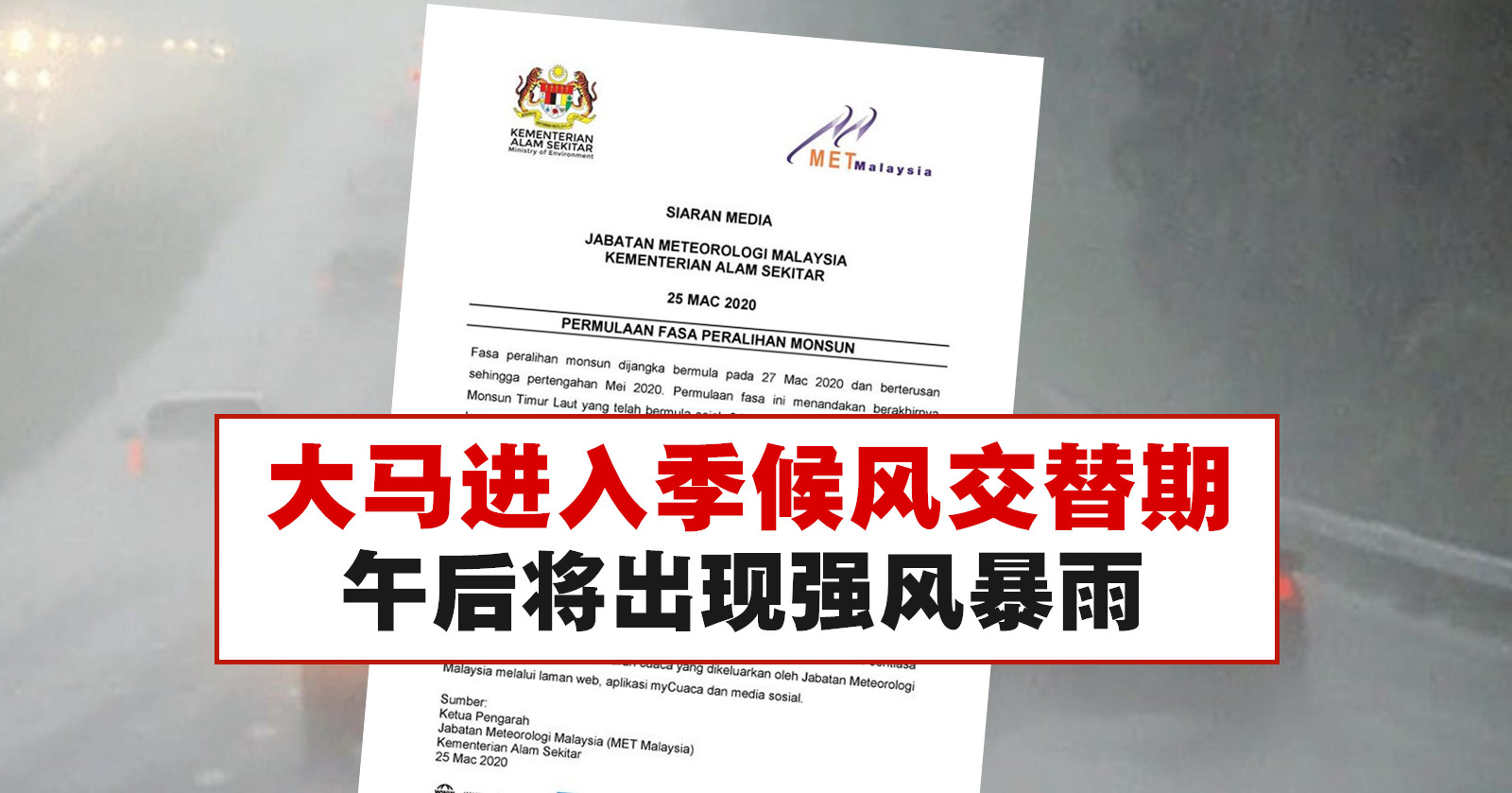 根据大马气象局于3月25日所发出的文告显示,大马将在3月27日进入季候风交替期。在季候风交替期间,大马各地将会在午后和傍晚出现雷雨或强风的现象。