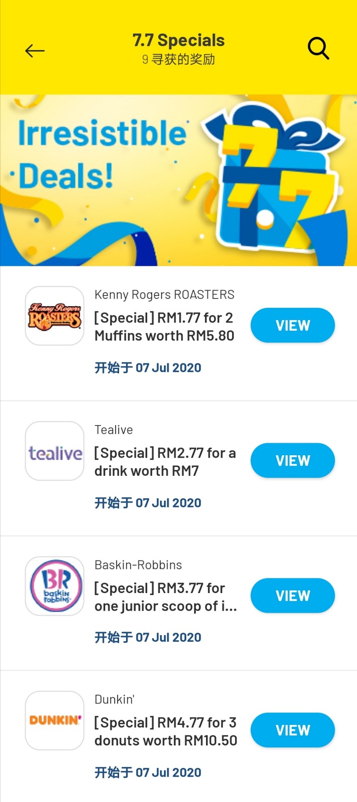 原价RM5.80的Kenny Rogers ROASTERS Muffins,你可以RM1.77的特价购买!原价RM7的Tealive饮料,你也可以RM2.77的特价购买!原价RM30.55的Pizza Hut Regular Pizza,你可以RM7.77的特价购买。