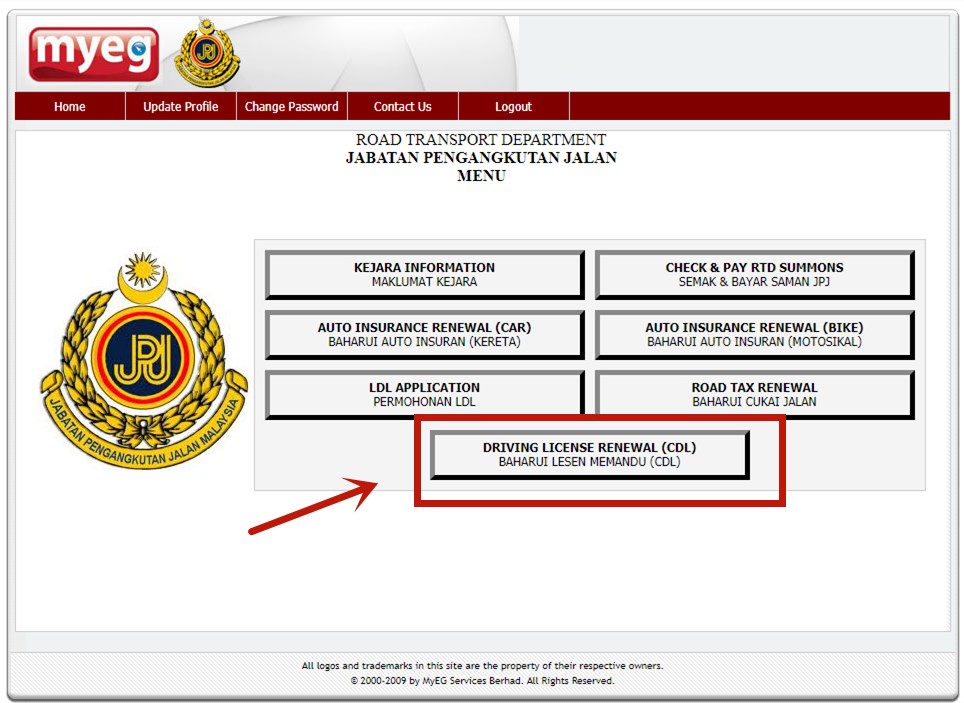 步骤3:选择Jabatan Pengangkutan Jalan,然后选择Driving License Renewal (CDL)。