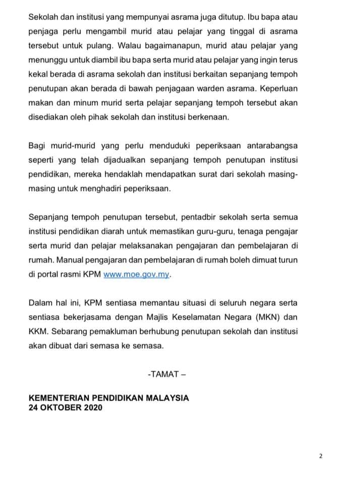 芙蓉被列为疫情红区,县内177所学校10月25日起关闭 十月 24, 2020 森美兰芙蓉的177所学校将从10月25日起关闭14天! 由于森美兰的芙蓉被卫生部列为疫情红区,教育部宣布芙蓉县内的177所学校从10月25日起停课,一直到11月9日,为期16天。 广告 若孩子居住在学校宿舍,父母可以携带孩子回家。至于那些还等待父母载送回家的学生或想要留在学校宿舍的学生,校方需要准备食物给学生。 在学校关闭的这段时间,校长、教师和学生需要继续进行线上教学。 教育部也发布了受影响的177所学校列表,赶紧查看孩子或你的学校是否是其中之一。 欢迎追踪我们的Telegram Channel 以获取最新最热消息。 Tags 学校