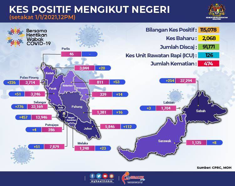 以下为各个州属和直辖区的新增病例详情,槟城226宗、霹雳51宗、雪兰莪776宗、吉隆坡457宗、布城4宗、森美兰51宗、马六甲23宗、吉打20宗、吉兰丹53宗、登嘉楼14宗、彭亨16宗、柔佛112宗、沙巴254宗、纳闽3宗、砂拉越8宗。