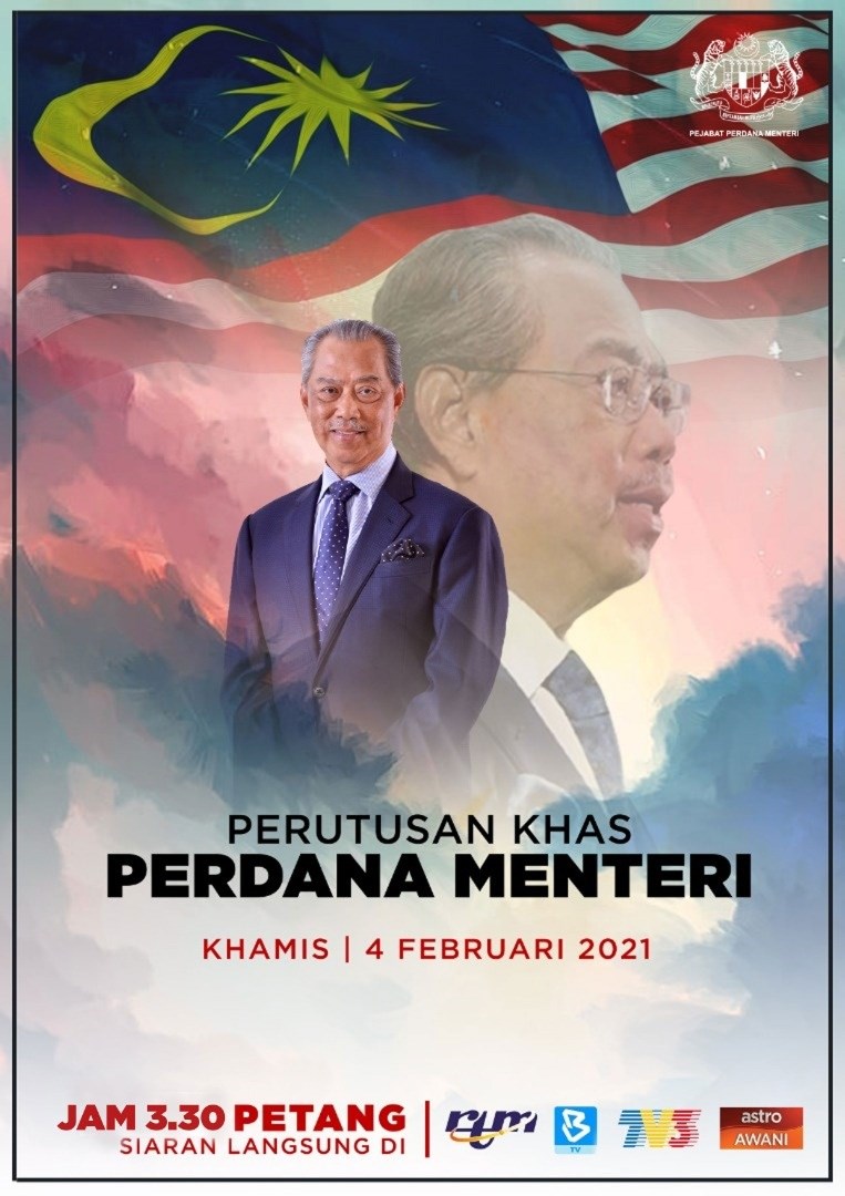根据慕尤丁面子书专页的消息,首相丹斯里慕尤丁将会在2021年2月4日下午3点30分发表电视讲话。此次电视讲话的主题为首相特别讲话(Perutusan Khas Perdana Menteri)。