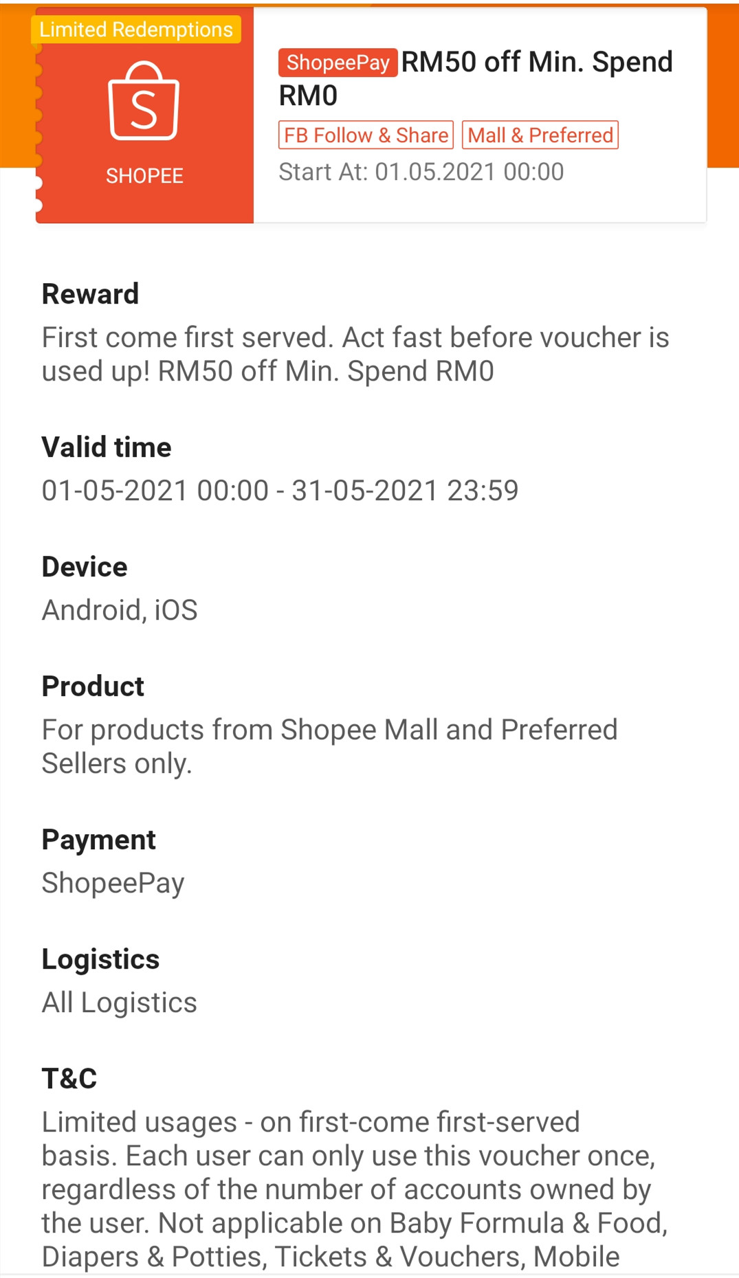 Shopee Shopee将5月1日凌晨12点起免费送出RM50折扣券。这个折扣券没有最低消费,不过数量有限!