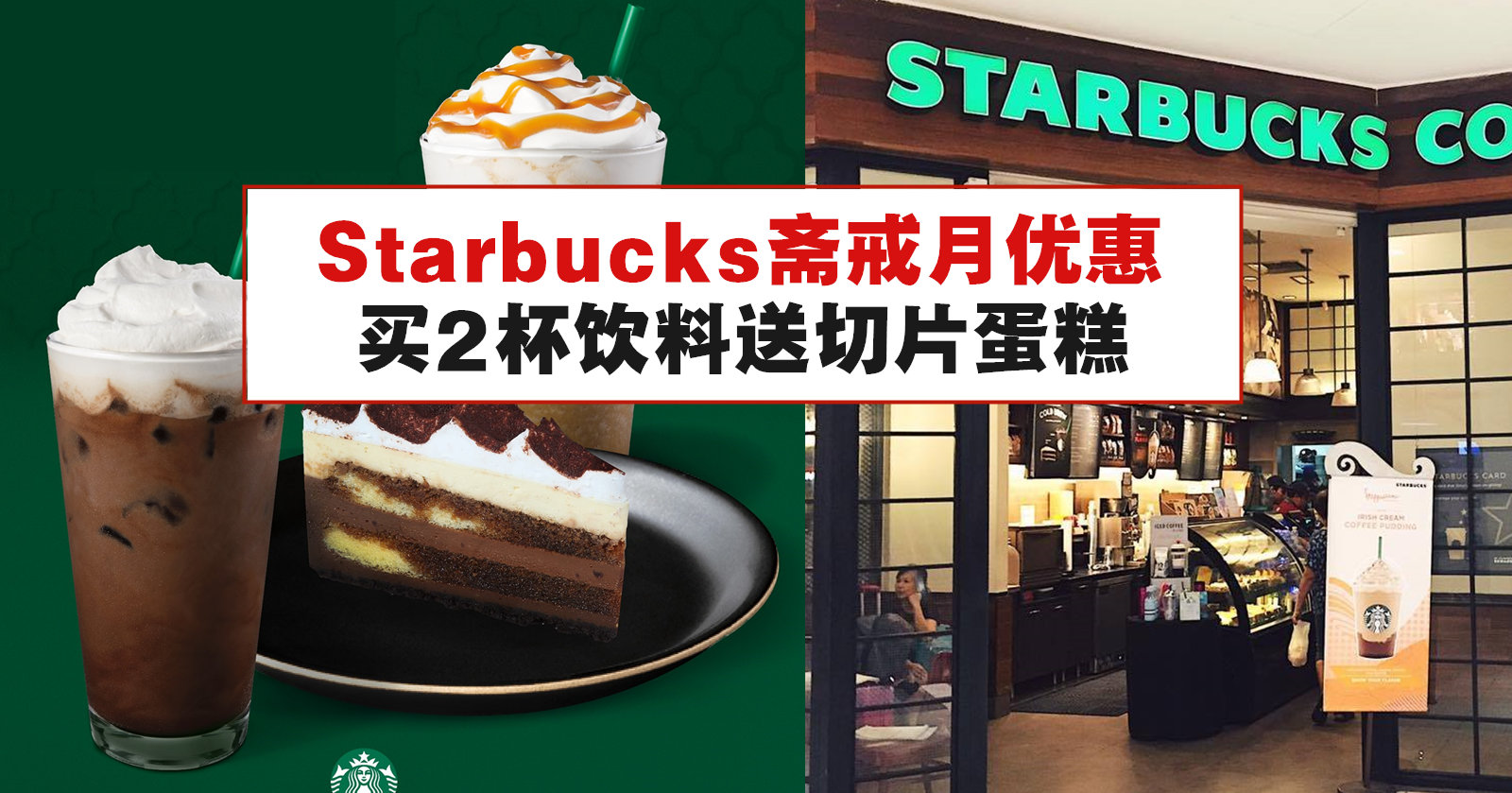 配合斋戒月的到来,星巴克(Starbucks)推出买饮料送切片蛋糕优惠。你只需购买2杯Venti Sized Frappuccino,就可免费获得一份切片蛋糕。