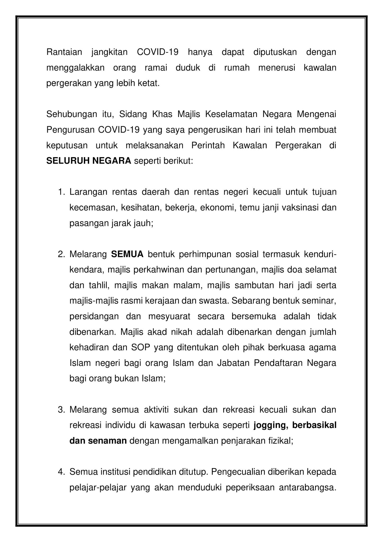 在这段时间,民众不获准堂食和进行社交活动,除了工作和健康的跨县将被禁止、所有运动(除了跑步、骑脚车和散步)、学校将关闭、每辆车最多只能容纳3人。