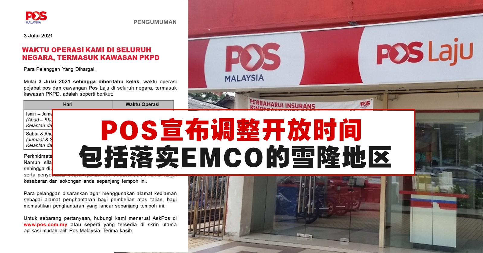 配合政府所实施的封锁措施,大马邮政(POS Malaysia)宣布将会调整各家分行的开放时间。这项措施已经从2021年7月3日起生效。
