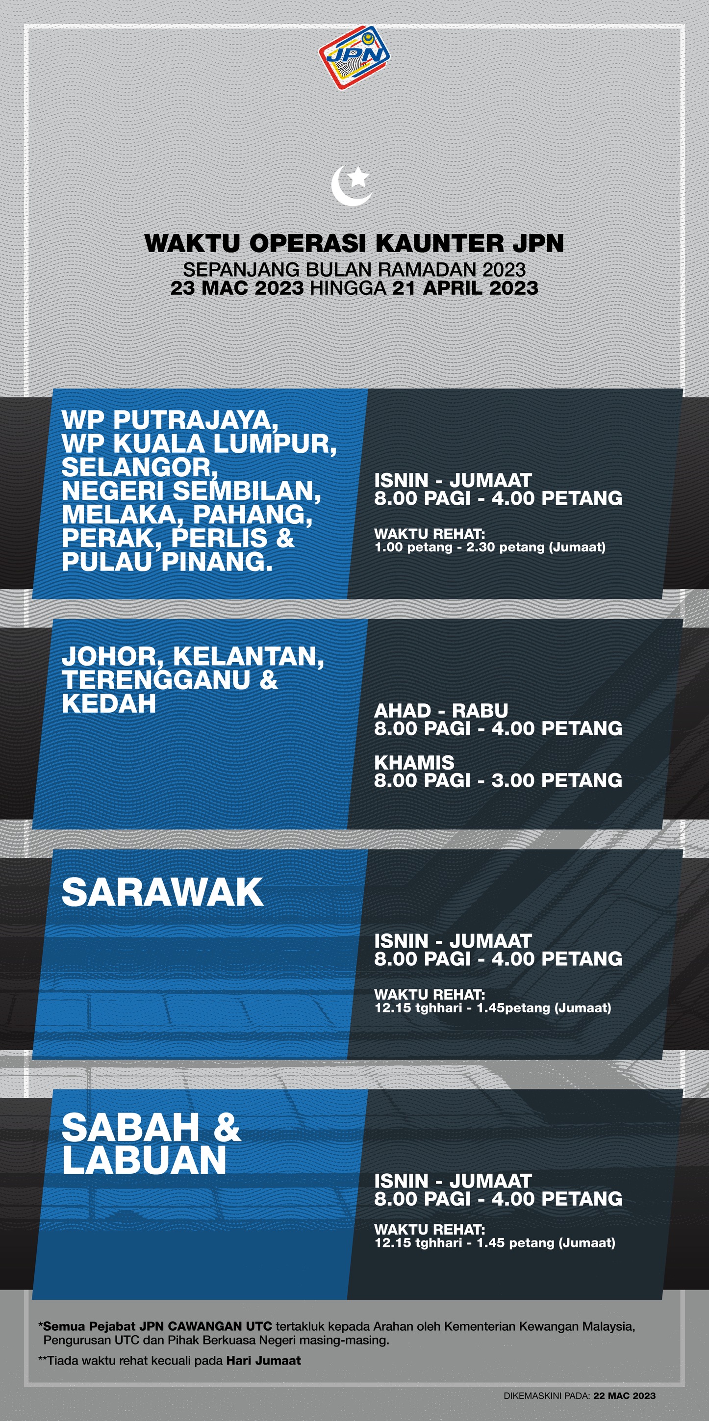 JPN在斋戒月期间调整办公时间 三月 22, 2023 配合斋戒月的到来,JPN调整了开放时间。如果你计划要在这段时间前往JPN办理事务,那你就要特别留意了。根据国民登记局(JPN)所发出的消息,西马和东马所有JPN分行的开放时间将调整成早上8点至下午4点,中午没有午休,除了星期五。西马JPN分行星期五的午休时间是中午1点至下午2点30分,东马JPN分行星期五的午休时间是中午12点15分至下午1点45分。ADVERTISEMENT 至于城市转型中心(UTC)jPN服务柜台的办公时间还需依据大马财政部、UTC管理层和各个州属所颁发的指示。 这项办公时间的有效期是2023年3月23日至4月21日。 Tags 斋戒月 jpn