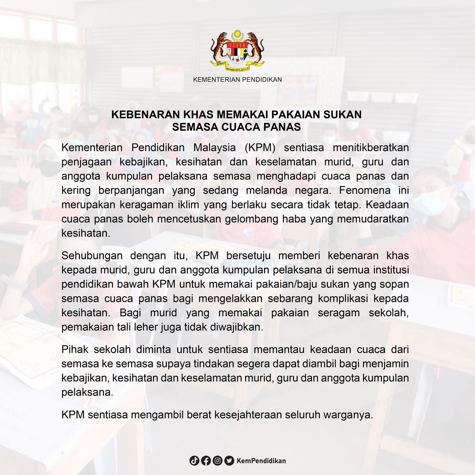 根据大马教育部所发出的文告显示,学生、教师和校方执行人员获准穿整齐的运动服到学校,而不需要穿制服。这项政策是教育部因应炎热天气的措施之一。